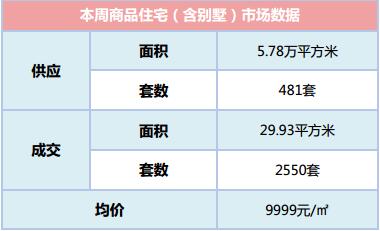 本周商品住宅成交面積29.93萬方,大幅上漲67.61%;成交套數為2550套,環比上漲67.32%。本周商品住宅成交均價為9999元/㎡,連續第三周上升,環比上漲4.94%。本周建工新城、中航云璽大宅、南悅城取得新預售證。