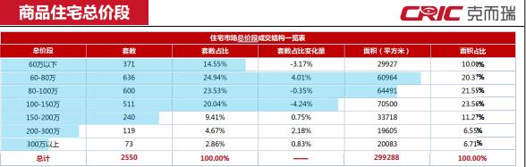 本周全市商品房成交集中于60-80萬、800-100萬、100-150萬三個總價段,分別占整周套數的24.94%、23.53%及20.04%,其中60-80萬產品成交上漲4.01%。