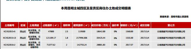 本周昆明主城四區及呈貢區商住辦土地成交3宗,占地面積24.03萬方,建筑面積48.03萬方,均為批發零售、住宿餐飲用地,位于西山區,成交金額80869.27萬元