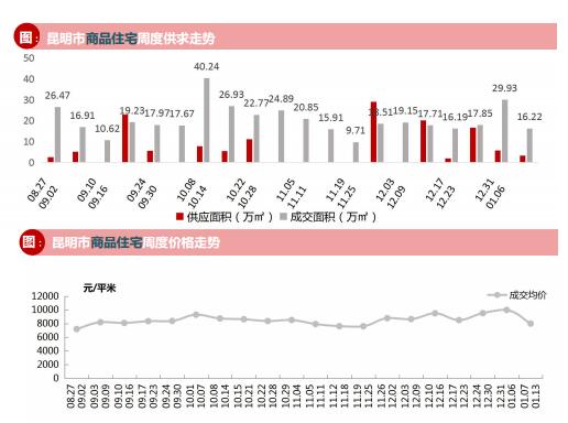 本周商品住宅成交面積16.62萬方,環(huán)比下跌45.79%;成交套數(shù)為1184套,環(huán)比下跌53.57%。商品住宅成交均價受高新水岸晴沙等低價項目大量備案的影響,大幅下降19.93%,為8006元/㎡。本周昆明主城四區(qū)及呈貢區(qū)商住辦土地?zé)o供應(yīng)。