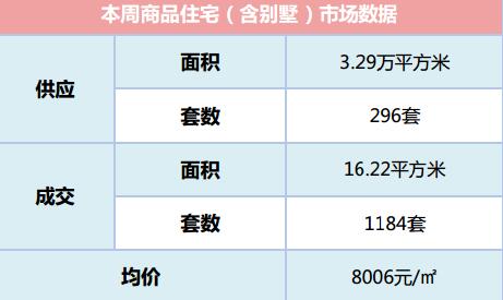 本周商品住宅成交面積16.62萬方,環(huán)比下跌45.79%;成交套數(shù)為1184套,環(huán)比下跌53.57%。本周商品住宅成交均價受高新水岸晴沙等低價項目大量備案的影響,大幅下降19.93%,為8006元/㎡。