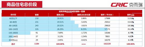 本周全市商品房成交集中于80-100萬、100-150萬三兩個總價段,分別占整周成交套數(shù)的20.52%及28.29%,其中100-150萬總價段產(chǎn)品成交上漲8.25%。