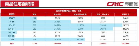 本周成交集中于90-120㎡、120-144㎡兩個面積段,分別占全周成交套數(shù)的26.77%及24.75%,其中90-120㎡產(chǎn)品成交下降11.15%;值得注意的是180+㎡以上面積段成交本周大幅上漲11.75%.