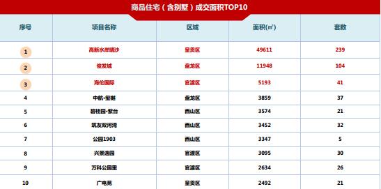 本周高新水岸晴沙獲得雙榜冠軍,俊發(fā)城排列第二;興景逸園、廣電苑進(jìn)入成交面積榜前十。