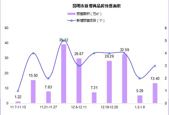 新增預售項目方面:上周昆明商品房新增預售項目2個,本周新增預售項目3個;
