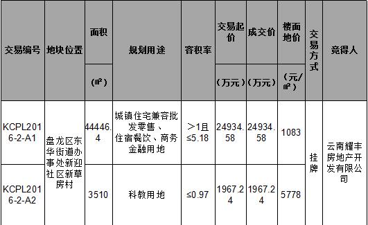 土地市場:本周(01.09-01.15)昆明土地市場本周無土地推出,本周有2宗土地成交。