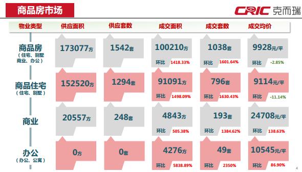 本周整體市場恢復正常水平,商品住宅成交面積9.11萬方,環比大漲1498.09%;成交套數為796套,環比上漲1630.43%。商品住宅成交均價為9114元/㎡,環比下跌11.14%。