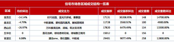 本周全市商品住宅成交量較上周大幅增加,其中官渡區成交占全周的32.27%,而漲幅最大為呈貢區30208.95%。本周全市商品住宅成交價格整體下跌,而官渡區量價齊升,均價上漲6.08%;其余各區均有下降。
