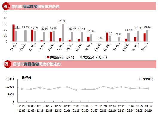 本周商品住宅成交面積19.14萬(wàn)方,環(huán)比上漲5.48%;成交套數(shù)為1659套,隨之上漲5.33%。商品住宅成交均價(jià)為8995元/㎡,環(huán)比下降3.19%。本周昆明主城四區(qū)及呈貢區(qū)商住辦土地?zé)o供應(yīng)和成交。