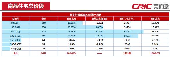 本周全市商品房成交集中于60-150萬(wàn)總價(jià)段區(qū)間,共占整周成交套數(shù)的76.25%,各總價(jià)段成交平穩(wěn),起伏不大。