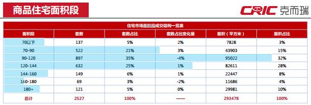 本周由于萬(wàn)科云子、 中昆醫(yī)大廣場(chǎng)等項(xiàng)目集中成交,90-144㎡面積段仍位居第一,成交套數(shù)占總套數(shù)的60%