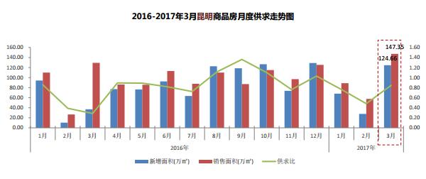 昆明-月度供銷走勢:歷經2月的低迷期,本月市場供銷劇增,樓市回暖跡象明顯。新增面積124.66萬方,環比增長348.86%,同比增長237.87%;銷售面積147.35萬方,環比增長155.63%,同比增長13.92%。