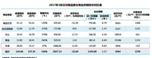本月商品房各物業類型銷量均大幅增長;商品住宅庫存595.65萬方,按照近一年銷售755.86萬方的去化速度,需0.79年消化;商業、辦公和車庫庫存仍高,去化速度緩慢,壓力巨大。