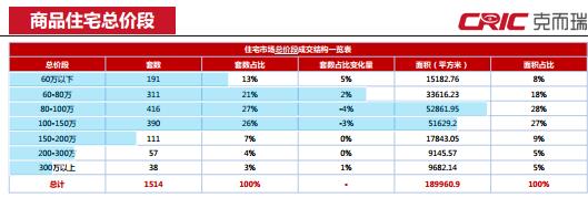 本周全市商品房成交集中于80-150萬總價段區間,共占整周成交套數的53%,本周60萬以下總價段占比增加5%,其他總價段占比變化不大。