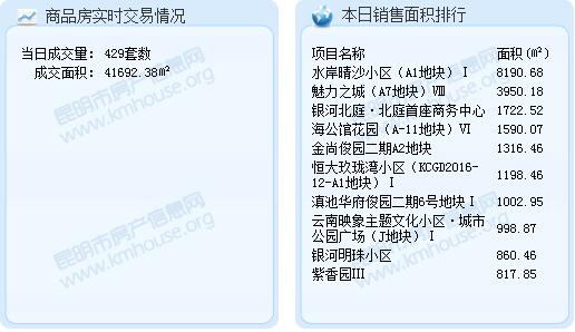 截至5月12日23:00,根據昆明市房產信息網數據,2017年5月12日昆明成交商品房成交429套,成交面積41692平米。今日成交套數排行前三的項目分別是:東旭駿城海公館花園(A-11地塊):39套;魅力之城(A7地塊):37套;水岸晴沙小區(A1地塊):31套。