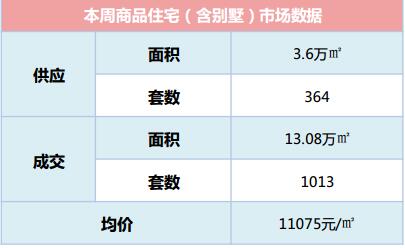 本周隨著俊發城、融創春風十里、時代俊園、融城春曉等項目集中備案結束,商品住宅成交面積大跌至13.08萬方,環比下降45.65%。成交套數為1013套,隨之下降49.85% 。本周商品住宅成交均價為11075元/㎡,環比上漲8.13% 。