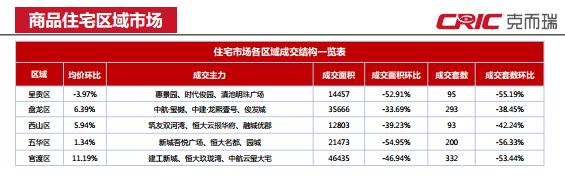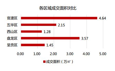 本周隨著上周一批熱銷項目集中備案結束(呈貢區:倚瀾苑、時代俊園;盤龍區:俊發城;五華區:融創春風十里;官渡區:融城春曉、藍光水岸家園),全市商品住宅成交量下降45.65%,各區均有不同程度下降,降幅33%-55%,其中,呈貢區和五華區降幅均到達50%以上。