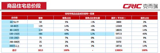 本周全市商品房成交集中于100-150萬總價段區間,共占整周成交套數的48%,比上周增加12%,100萬以下總價段占比繼續下降,300萬以上總價段占比增加3%。