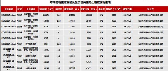 本周昆明主城四區及呈貢區商住辦土地成交24宗,土地面積共1390畝,可建體量共181萬方,成交金額共74.78億元,平均地價538萬元/畝,成交樓面價4132元/㎡。