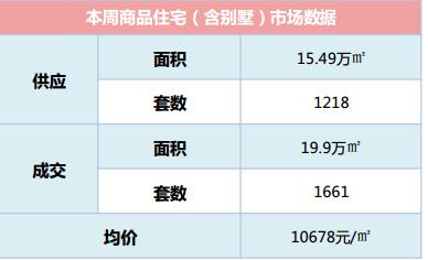 本周俊發灣流海、筑友雙河灣、新城吾悅廣場等項目集中備案,商品住宅成交面積增至19.9萬方,環比上漲19.27%。成交套數為1661套,隨之上漲22.4% 。本周商品住宅成交均價為10678元/㎡,環比上漲2%。