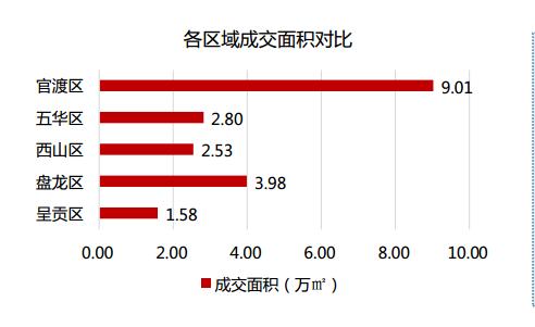本周俊發灣流海、筑友雙河灣、新城吾悅廣場等項目集中備案,官渡區、西山區及五華區成交大增,漲幅分別到達51%、 37%和23%;成交均價方面,西山區漲幅較大,其他區域較為穩定。本周商品住宅成交集中亍官渡區,其次為盤龍區,呈貢區市場火熱,供應端緊缺,導致成交也大幅縮水。