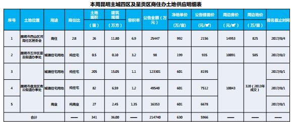 本周供應(yīng)土地5宗,其中住宅用地3宗,商住用地1宗,商業(yè)用地1宗,土地面積共341畝,可建體量共36萬(wàn)方,掛牌金額共21.47億元,平均地價(jià)630萬(wàn)元/畝,掛牌樓面價(jià)5966元/㎡。