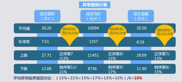 樓市縱覽[異常值監測]與均值超過所有統計樣本標準差的統計值;選取2016年7月17日—2017年7月23日之間的53周為樣本周期,得出異常臨界值。