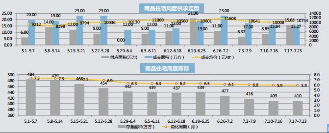 本周成交15.27萬方,環比下降4%,市場供應減少,可售貨源不足,成交量相應下滑。本周成交均價10744元/平米,環比增長7%,市場供不應求,成交價格居高不下。市場呈現供不應求態勢,庫存量持續下滑,截止本周庫存410萬方,去化周期下降至5.9個月。