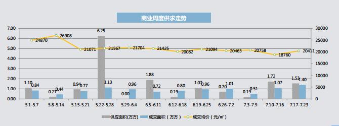本周成交以遠郊低價和呈貢新區核心板塊優質底商為支撐,均價有所回升。本周主城區商業市場供應1.53方,環比下降11%,主要為萬彩城、新城吾悅廣場、中海龍泉公館項目。本周成交1.4萬方,環比上漲31%,本周成交以遠郊低價和呈貢新區核心板塊優質底商為主,主力成交項目為于嶺星河莊園、 第七街區和斗南江于花卉配套用品博覽中心。本周成交均價20411元/㎡,環比上漲9%。