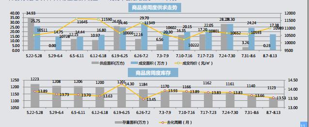 本周供求比大大下降,庫存量繼續下滑至1123萬方,去化周期為13.53個月。