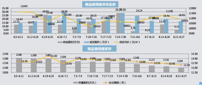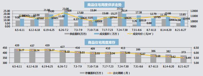 住宅市場呈現(xiàn)供不應求態(tài)勢,庫存量繼續(xù)減少,截止本周庫存373萬方,去化周期下降至5.49個月。