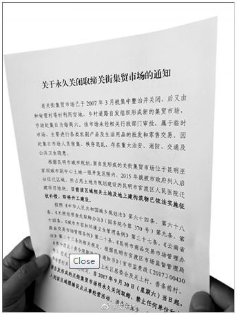 通知上還說,經關上街道辦事處、關上社區居委會及關上村、香條前村、和甸營村共同研究決定,自2017年9月30日(星期六)當日起,新自發形成的關街集貿市場將永久關閉取締,禁止任何單位和個人到該區域擺攤設點從事經營活動。