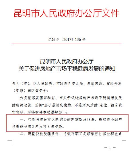 要點一:在昆明市呈貢區新購買的新建商品住房,需取得不動產權屬證書滿2年方可上市交易。
