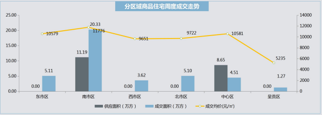 從各區域來看,本周南市區以11.19萬方,供應量排在第一,為主力供應區域,東市區、西市區、北市區、呈貢區本周無新增供應.