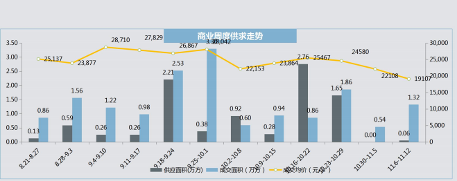 商業本周少量供應,成交增長明顯,受主力成交項目影響,成交均價下滑