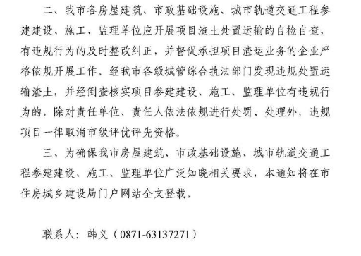 日前,昆明市住房和城鄉建設局發布了《關于加強我市房屋建筑工程、市政基礎設施工程、城市軌道交通工程渣土外運工地源頭管理的通知》,要求協助從工地源頭加強渣土外運管理,遏制無資質渣運車輛在昆明市主城區從事渣土處置運輸。