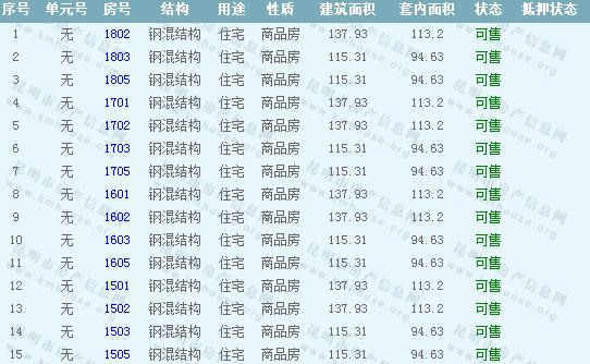 依據《云南省商品房銷售明碼標價實施細則》,商品房經營者應當在商品房交易(銷售)場所的醒目位置放置標價牌、價目表或者價格手冊,有條件的可同時采取電子信息屏、多媒體終端或電腦查詢等方式。商品房銷售明碼標價應當做到價目齊全,標價(示)內容真實明確、字跡清晰、標示醒目,并標示價格主管部門12358投訴舉報電話。萬科翡翠準售房源信息如下: