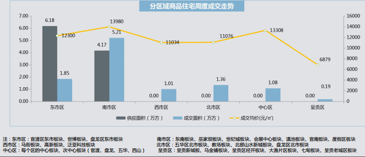 各區(qū)域成交來(lái)看,南市區(qū)持續(xù)領(lǐng)先,成交5.21萬(wàn)方.占比49%,南市區(qū)本周成交量增價(jià)跌