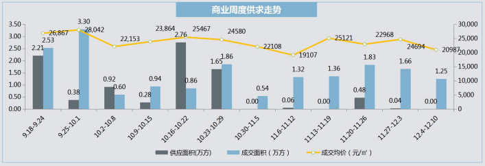 本周成交均價(jià)12465元/平米,環(huán)比下跌3.3%,住宅市場(chǎng)均價(jià)波動(dòng)平緩