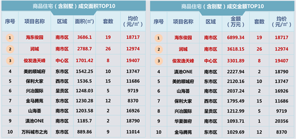 受集中備案影響本周海東俊園、潤城、俊發(fā)逸天峰位于TOP10榜單前三。
