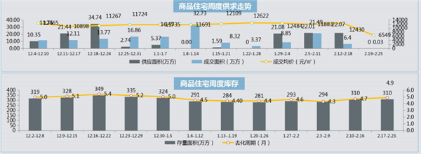 本周住宅無(wú)新增供應(yīng),受春節(jié)長(zhǎng)假期影響,成交量?jī)r(jià)齊跌,存量有所增加,去化周期有所延長(zhǎng)