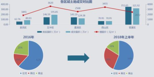官渡區和五華區成交量最大,主城四區中西山區和五華區樓面價均價破3000 p 18年上半年昆明土地成交主要集中在官渡區和五華區,從樓面價五華區和西山區樓面價破3000。巫家壩板塊和范亞科技板塊大量 優質土地成交將推動項目所在區域的發展 p 從成交結構來看,仍以住宅屬性土地為主,但商住類土地占比大幅度增加,住宅和商業類土地占比下降。