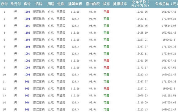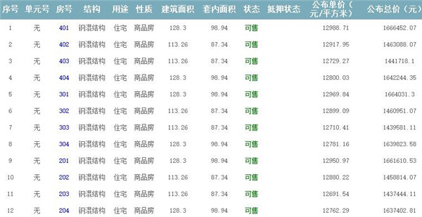 根據云南省物價局關于發布《云南省商品房銷售明碼標價實施細則(試行)》的通知,現將該項目商品住房的準售房源及每套房屋價格向社會公布,房地產開發企業應嚴格按照公布價格,商品房銷售明碼標價實行一套一標。商品房經營者應當對每套商品房按照建筑面具進行明碼標價,否則,房產登記機關不予登記備案。準售房源及房價信息如下:
