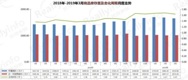 截止2019年3月31日,商品房庫存1654.48萬方,按近一年銷售面積1013.36萬方計算,還需1.63年去化,去化周期略有下降。
