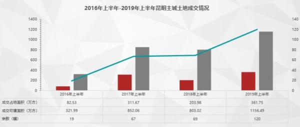 據本機構統計,2019年上半年,昆明市土地交易中心和昆明市國土資源公示供應商住辦土地共120宗,擬出讓占地面積共計361.75萬平米,建筑面積1156.49㎡,較去年同期上漲44.02%。政府供地節奏加快促成成交量上升。