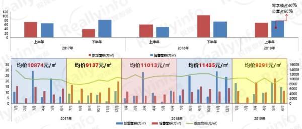 【供銷價】價格受低價單盤銷售影響較大:上半年辦公新增量69.66萬㎡,同比上漲11.92%;成交79.37萬㎡,同比上漲59.16%。成交均價9291元/㎡,同比下降15.63%。