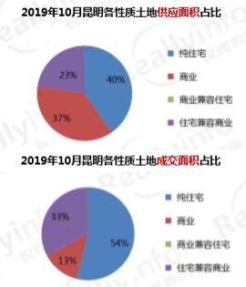 10月昆明純住宅用地成交11宗,面積841.62畝,占比54%;10月昆明商業用地成交5宗,面積203.41畝,占比13%;10月昆明商業兼容住宅用地無成交;10月昆明住宅兼容商業用地成交8宗,面積512.04畝,占比33%。