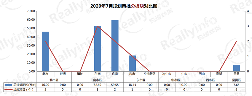 規(guī)劃:從月度走勢看,本月過規(guī)項(xiàng)目個(gè)數(shù)與上月持平,過規(guī)總建面較上月小幅上漲, 但與去年同期相比, 過規(guī)項(xiàng)目個(gè)數(shù)與總建面都有大幅下滑。共有8個(gè)商品房項(xiàng)目過規(guī)10次,過規(guī)總建面184.42萬方,其中南市區(qū)過規(guī)體量最大,過規(guī)建面112.24萬方,占比61%。