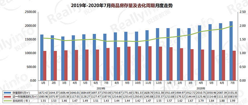 截止2020年7月31日,商品房庫存2155.35萬方,按近一年銷售面積1083.93萬方計(jì)算,還需1.99年去化,去化周期較上月略有延長。