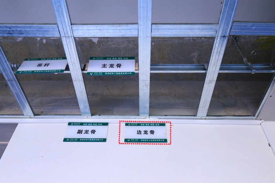 在整個房屋最為關鍵的“骨架”部分,綠城誠園在傳統的主、副龍骨設計之外,加裝了一處橫撐龍骨。不要小看這一處變化,用掛件固定在副龍骨上這一橫撐龍骨,通過卡鉗進行緊固,使得整體的框架結構更為穩固,從根本上提升了吊頂的強度。